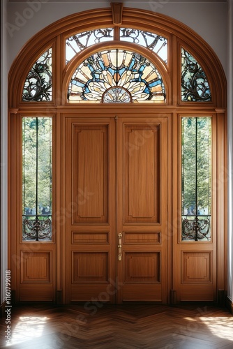 Victorian-style museum entrance showcases large wooden doors and stunning stained glass windows illuminated by sunlight