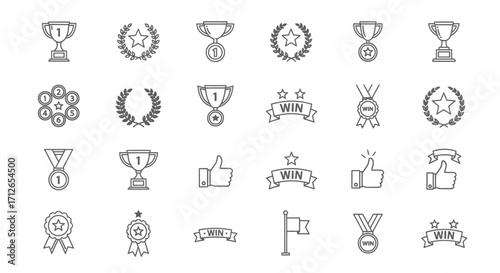 Victory Icons Set Trophies Stars Ribbons Thumbs Up and Win Symbols for Success Achievement