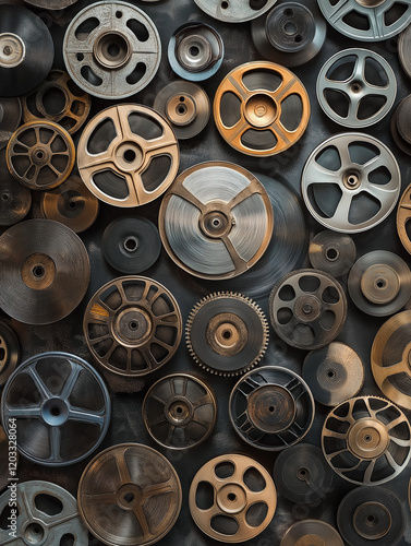 Vielfältige Filmrollen und Spulen in einem künstlerischen Arrangement