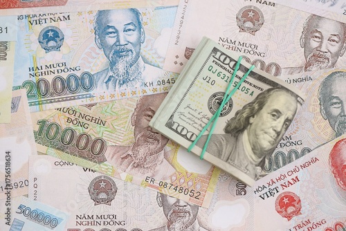 Vietnamese dong currency money bills and bunch of us dollar banknotes close up. The concept of economics and currency exchange