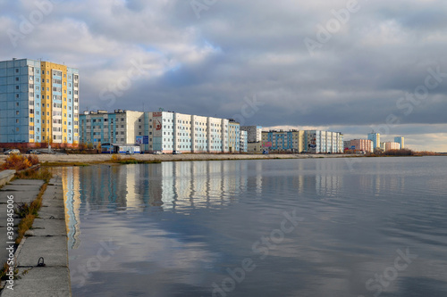 View at residential houses on the bank of Yantarnoye (Amber) lake. Nadym, Yamalo-Nenets Autonomous Okrug (Yamal), Russia.