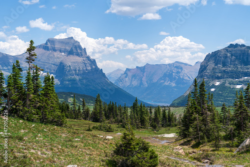 View from Logan Pass in Glacier National Park, Montana on a sunny summer day, with glacial valley, snow-capped mountains, alpine lakes, and grass