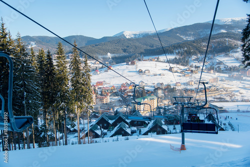 View from ski lift at winter ski resort in the mountains on a sunny morning nature calamity peace travel tourism concept