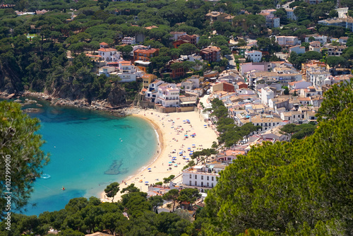 view from the hills to the beautiful bay with beach and promenade of the village Llafranc, Costa Brava, Girona, Catalonia, Spain