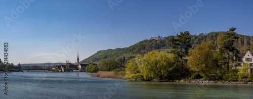 View from the island group of Werd on the Rhine, behind the old town of Stein am Rhein and the Hohenklingen Castle, Canton of Schaffhausen, Switzerland, Europe
