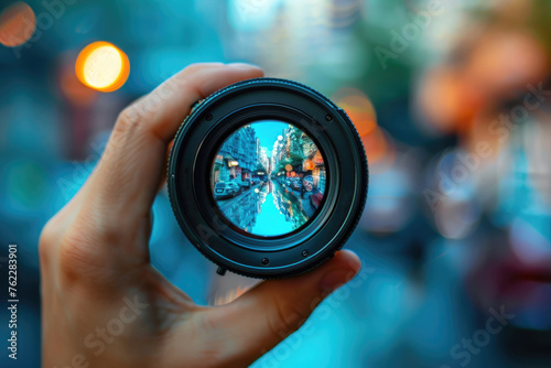 View of a city street through a photo lens, concept of photographer, photographic equipment