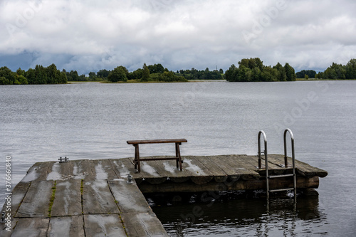 view of a large beautiful lake against the backdrop of clouds and blue sky