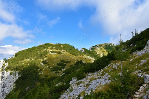 View of alpine landscape at the top of Debela Pec mountain in Julian alps and Triglav national park, Gorenjska, Slovenia