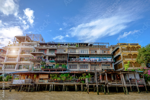 View of Chao Phraya River with blue sky and down-town Old colorful buildings in Bangkok, Thailand