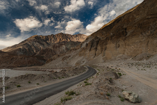 View of majestic mountains and a winding road under a dramatic sky, Fairy Meadows National Park, Pakistan.