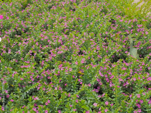 view of many Purple False Heather (Cuphea hyssopifolia 'Purple') blossom with many little bees feeding in garden.