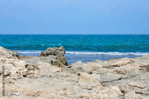 View of sandstone formations on the Mediterranean coast at low tide. Israel