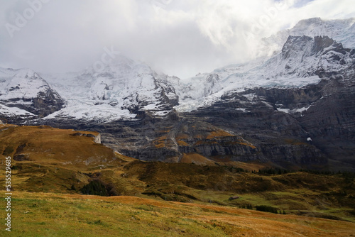 View of snow alp mountain landscape in autumn nature at swiss from the train