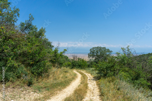 View of the Alazani Valley from a high mountain. Rocks and trees around. Earthen dirt road. Agrarian fields are visible. Clear blue sky and clouds over the Caucasus ridge.