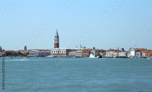 View of the island of venice with ancient palaces and bell towers with long exposure time and the wake of the movement of ships on the Venetian lagoon