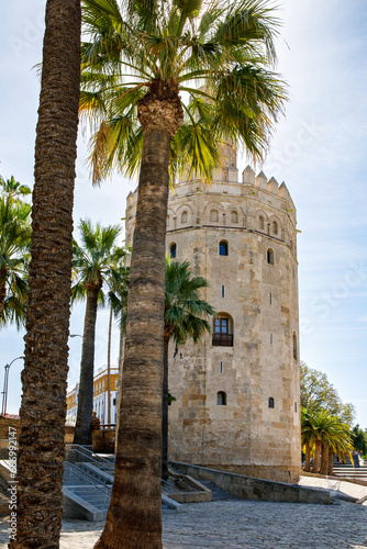 View of the Torre del Oro in Seville, Andalusia, Spain over the Guadalquivir river on sunny day
