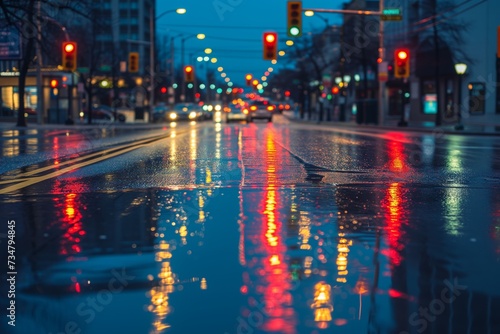 view of traffic lights reflecting on a wet city street at night