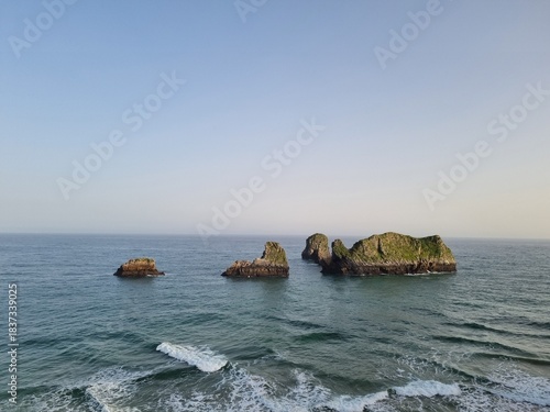 View on Playa de Palombina in Celorio village, Green coast of Asturias, North Spain with sandy beaches, cliffs, hidden caves, green fields, forests and mountains.