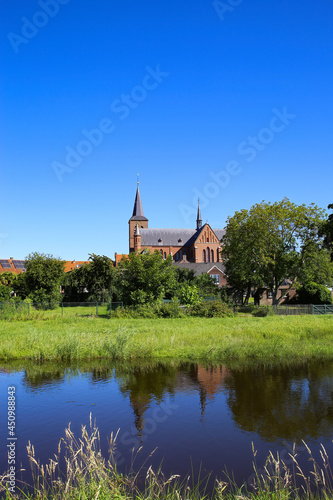 View over river and green pasture on small dutch idyllic village with medieval old church against blue cloudless summer sky - Neer (Limburg), Netherlands