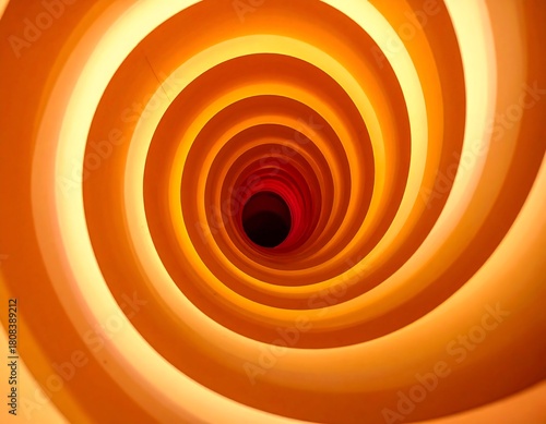 View through a luminous orange spiral tunnel leading to a dark center