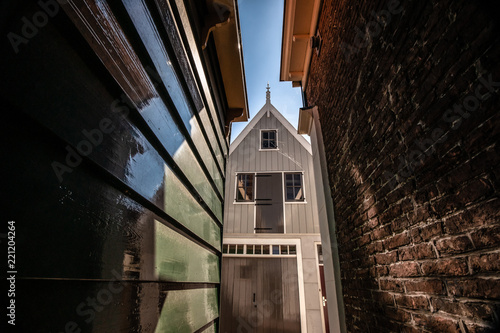 View through alleys and streets of a traditional Dutch village with wooden colorful houses, authentic Dutch architecture and half-timbered houses