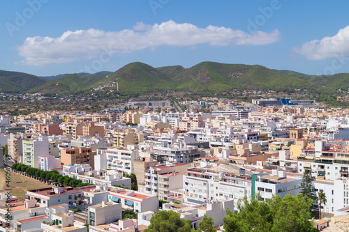 Views from above of Ibiza town (Balearic Islands, Spain). Landscape that contrasts the city in the foreground and the mountain in the background on a sunny day.