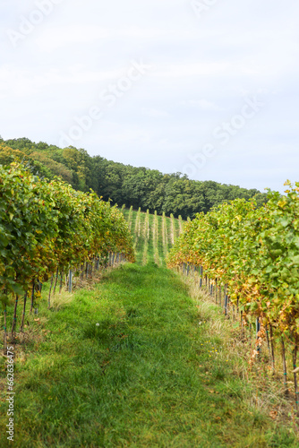 Vineyard in the countryside of Czechia, south Moravia. Pálava region near the town of Mikulov. Wine making.