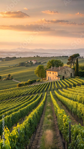 Vineyard in the Golden Hour - A rolling vineyard bathed in the warm, golden light of late afternoon. Rows of lush green grapevines stretch toward the horizon, with a charming stone farmhouse