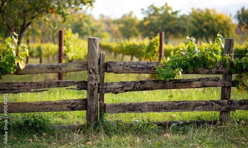 Vineyard with a rustic wooden fence and grapevines