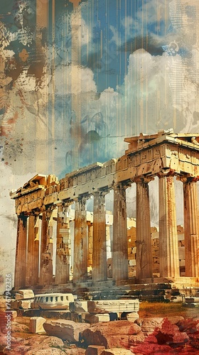 Vintage abstract art overlay on Acropolis, symbolizing the journey of adoption