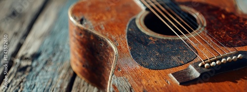 Vintage acoustic guitar on wooden floor, warm lighting for music and instrument visuals