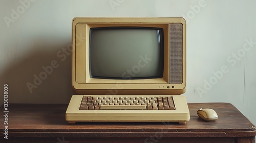 Vintage Beige Computer with CRT Monitor on Wooden Desk, Vintage beige computer with CRT monitor and keyboard on a wooden desk