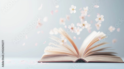 Vintage book pages adorned with softly falling pink cherry blossoms, symbolizing springtime renewal and literary inspiration