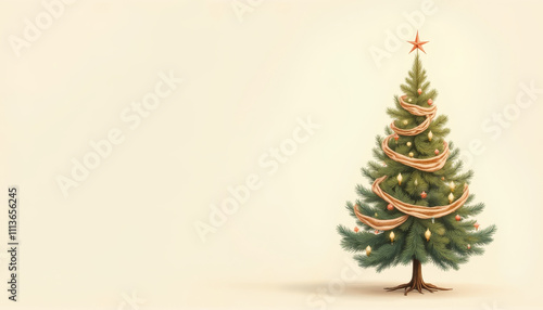 Vintage Christmas tree decorated with ribbons and ornaments on light background for holiday card concept copy space