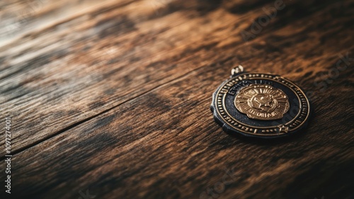 Vintage coin pendant on rustic wooden surface, dim lighting