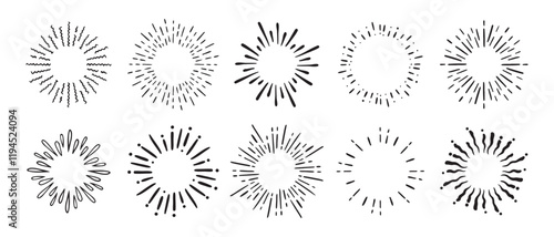 Vintage doodle Fireworks Sunburst Explosion set. Hand drawn Design Elements Black Rays