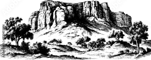 Vintage engraved landscape of cliffs and trees for artistic decoration