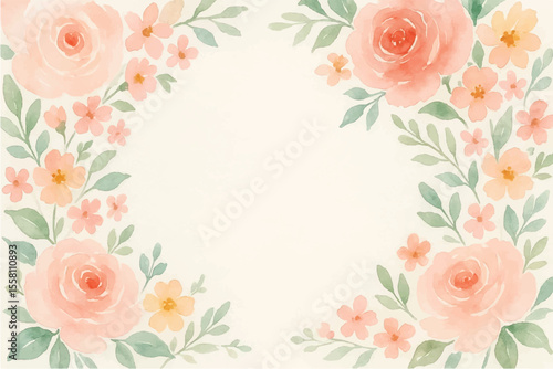 Vintage floral background with romantic pink roses, elegant frame, and decorative hearts for a wedding or Valentine's Day card design