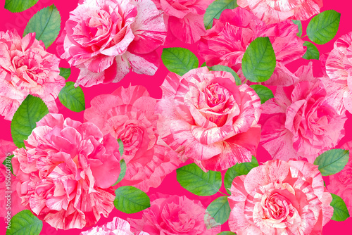 Vintage Floral seamless pattern. Summer Flower illustration. Amazing roses in Full Bloom. Luxurious garden flowers on vibrant pink background. For textiles, wallpaper, wrapping paper