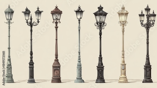 Vintage hand-drawn illustration of a collection of ornate Victorian street lamps and gas lanterns in classic sepia ink style on textured paper background