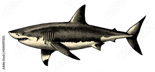 Vintage illustration of a shark showcasing intricate details and features isolated on a transparent background, perfect for marine biology enthusiasts and ocean-themed art, PNG