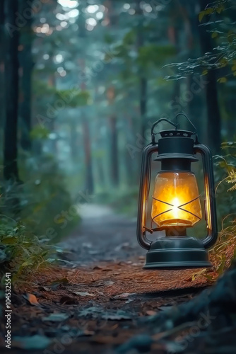 vintage lantern illuminating a tranquil path in a serene forest