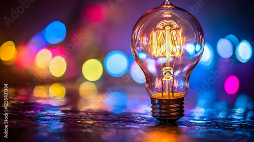 Vintage light bulb glowing amidst colorful bokeh lights on reflective surface