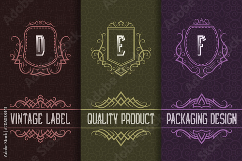 Vintage packaging design with monograms logos. Set of labels templates for quality product.