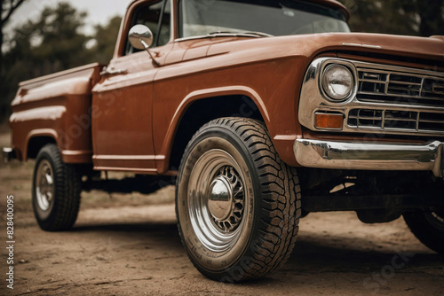 Vintage pickup truck, close-up shot of a wheel and tire, headlight