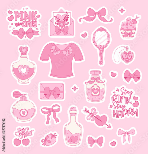 Vintage Pink Coquette Stickers set. Romantic Girly Vibe. Magic Bottle, Perfume, Ribbon Bow, Mirror, Pendant, Sweet, Letter Love, Quote Lettering and Arrow. Vector Isolated Trendy Aesthetic Elements
