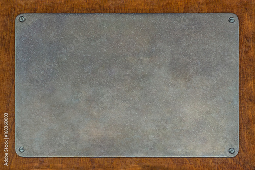 Vintage scrapped metal notice or signboard screwed to wooden board. Empty copy space for any text.