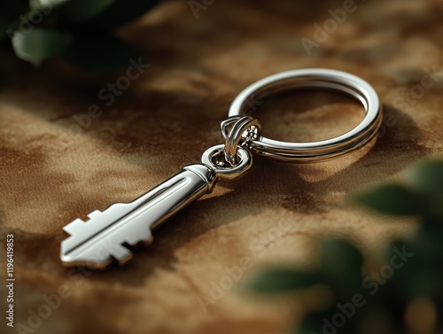 Vintage Silver Key Charm on Ring with Soft Focus Background
