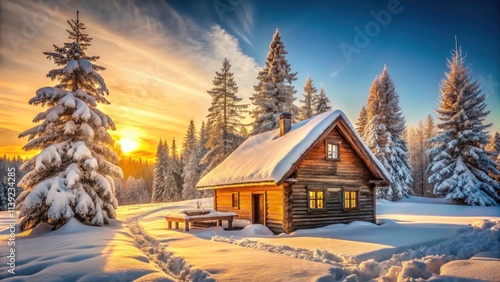Vintage Style Photography of a Cozy Wooden House Surrounded by Snow in a Winter Wonderland, Rustic Charm, Warm Glow, Scenic Landscape, Perfect for Holiday Decor and Seasonal Imagery