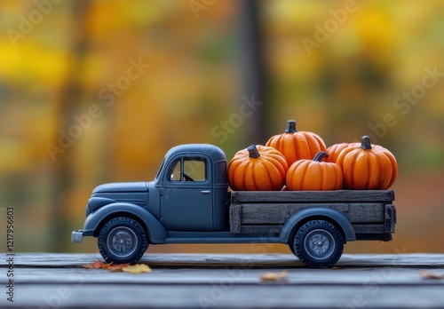 Vintage Toy Truck Loaded with Bright Orange Pumpkins in an Autumn Landscape Reflecting the Beauty of Fall Harvest and Festive Seasonal Decor